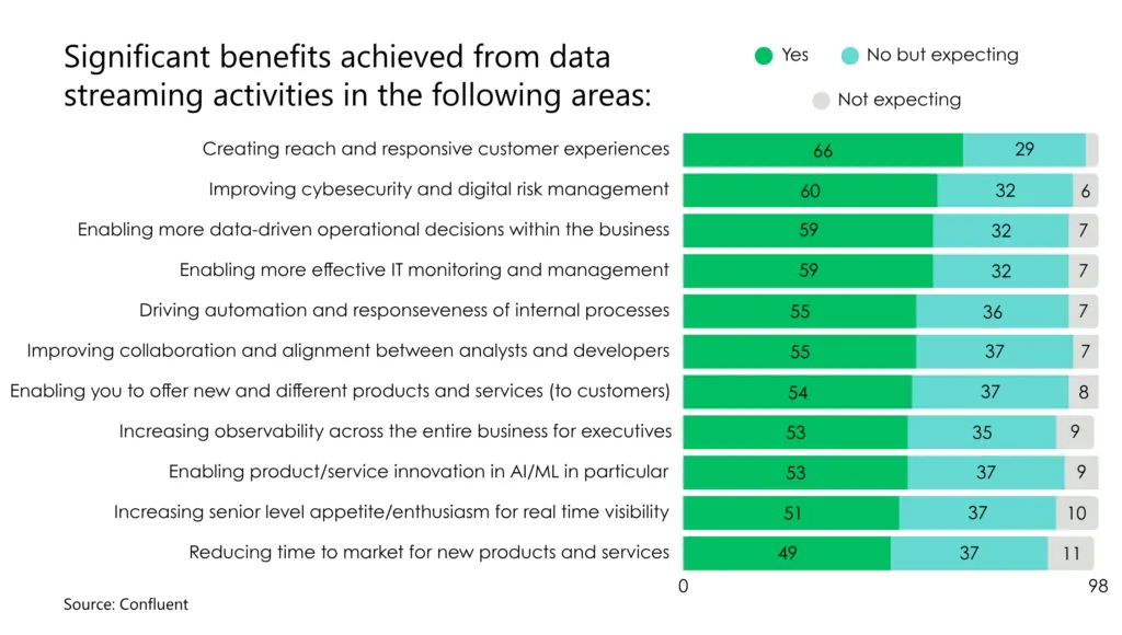 However, replacing batch-based pipelines with real-time streaming versions for select use cases comes with proven ROI. Respondents to a Confluent survey reported benefits like better CX, improved risk management capabilities, more effective IT management, and transition to more data-driven operations, among others.